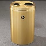 | ✚✚✚ Glaro RecyclePro II Receptacle, 33 Gallon, 20 inch W, 4-7/8 inch Dia. hole & 7 inch Dia. hole, Bottles & Cans - Waste messages w/ Recycling Logo, Espresso Brown Finish, Satin Brass Top, Shown in Satin Brass Glaro RecyclePro II Receptacles are designed to collect two types of recyclables. Two openings, a 4-7/8 inch dia. hole & a 7 inch dia. hole, allow these receptacles to hold up to 33 gallons of recycling. Featuring a separate poly bag below each opening that is designed to expand into more than 50% of the capacity as space allows, the recycling cans are ideal for indoor or outdoor use. The cans are available in 2 all metal finishes; All Satin Aluminum and All Satin Brass; or 5 designer powder coat finishes; Satin Black, Burgundy, Desert Stone, Hunter Green and Espresso Brown - with your choice of a Satin Aluminum, Satin Brass or Matching Powder Coat finish cover.